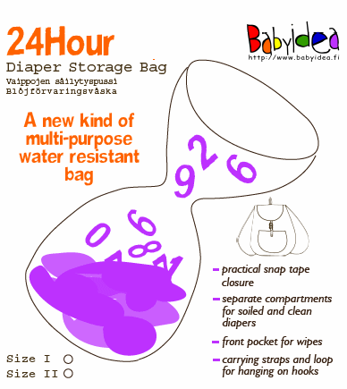 24Hour is a totally new type of diaper storage bag with two separate compartments, one for clean and one for dirty diapers. Perfect for the kindergarten and on the go, also for using in the bathroom to have diapers at hand. The 24Hour bag has snap tape closure, a handy pocket for wipes in front, straps for carrying and a loop for hanging on any type of knob.