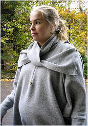 The scarf has a special design making it a conveniant neck rest for a sleeping baby, now wider than before. You can also nurse your baby inside the poncho while keeping important eye contact. Stylish pockets to keep your hands warm. Generous removable hood with medieval look. |