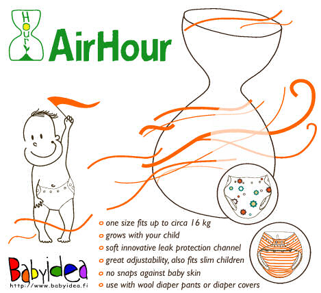 The Babyidea Air Hour pocket diapers are colourful and supersoft. They are made of organic cotton interlock and an absorbent layer of hemp/organic cotton fleece. The lining is made of soft custom made polyester fleece that confirms to Öko-Tex 100 norms and feels dry in use. The AirHour pockets are so called inner pockets, thus they are used with a diaper cover or wool diaper pants on top.